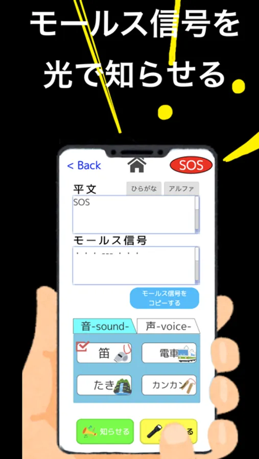 日本語(ひらがな、カタカナ、アルファベット、数字)を入力して変換ボタンを押すことで日本語(ひらがな、カタカナ、アルファベット、数字)をモールス信号に変換することができます。変換したモールス信号をホイッスル音やさまざまなボイスで再生することができます。またiPhoneに搭載されているカメラ横のLEDライトをモールス信号に合わせて光らせることも可能です。モールス信号から日本語への変換も行えます。