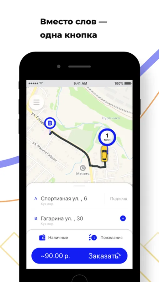 Откройте приложение, укажите адрес и закажите такси, нажав на одну кнопку.