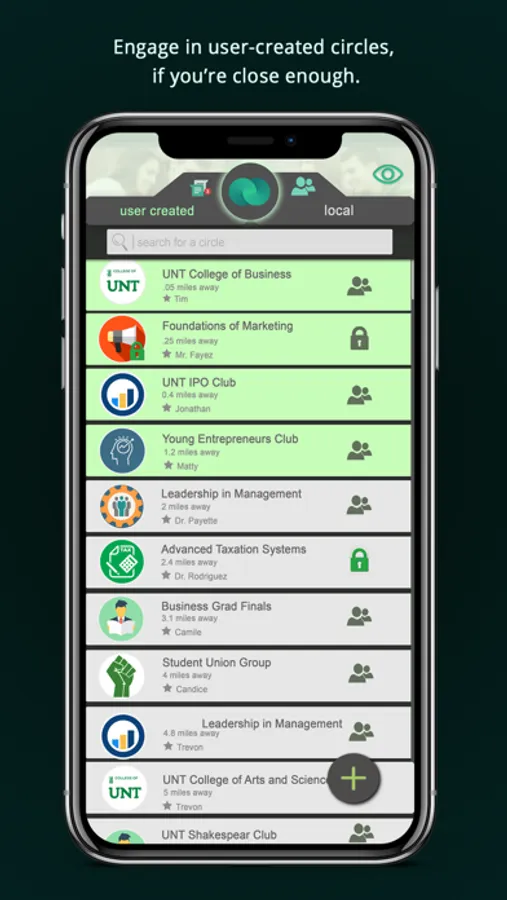 Immediately generates locations (circles) near you. Local circles include schools, bars, restaurants, attractions, and more.