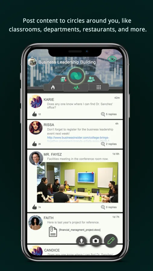 CirclesU is a hyper-localized content-sharing tool. Opening the app immediately populates locations near you. Universities, venues, restaurants, schools, bars, neighborhoods, and more are available for content sharing. And, if you don’t see a location (“circle”) you like, you can make your own!