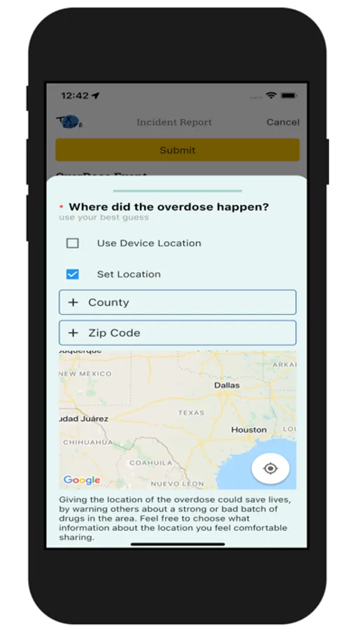 TxCOPE saves lives. This app enables members of the community to report overdose incidents that occur in Texas that may otherwise be unreported, particularly in cases when 911 is not called, an overdose is not readily apparent, or if the person who experienced the overdose does not go to the hospital. Having better data on the full extent of the overdose crisis, such as knowing when and where overdoses are happening, will allow for a better public health response, resource allocation, and prevention efforts, which will ultimately save lives.