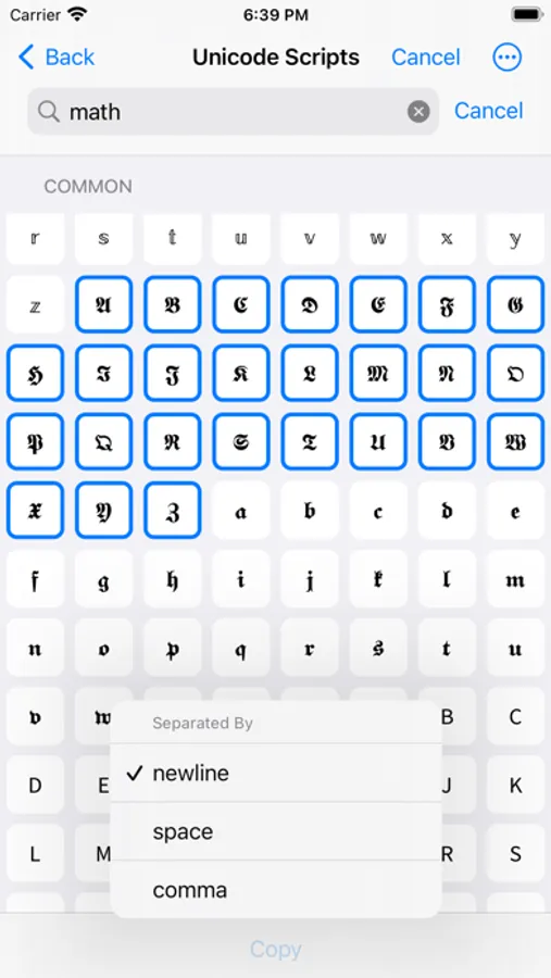- built-in browser for copying unicode characters