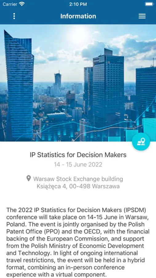 Application dedicated to the IP Statistics for Decision Makers 2022 Conference held on 14-15 June 2022 in Warsaw, Poland. The app was prepared by the Polish Patent Office which co-organises the conference in collaboration with the Organisation for Economic Co-operation and Development (OECD). The app allows the participants of the Conference to have all the conference-related information in one place. It includes, among others, the conference agenda, speaker bios, various conference materials and other useful information to help you get the best experience of the conference.
