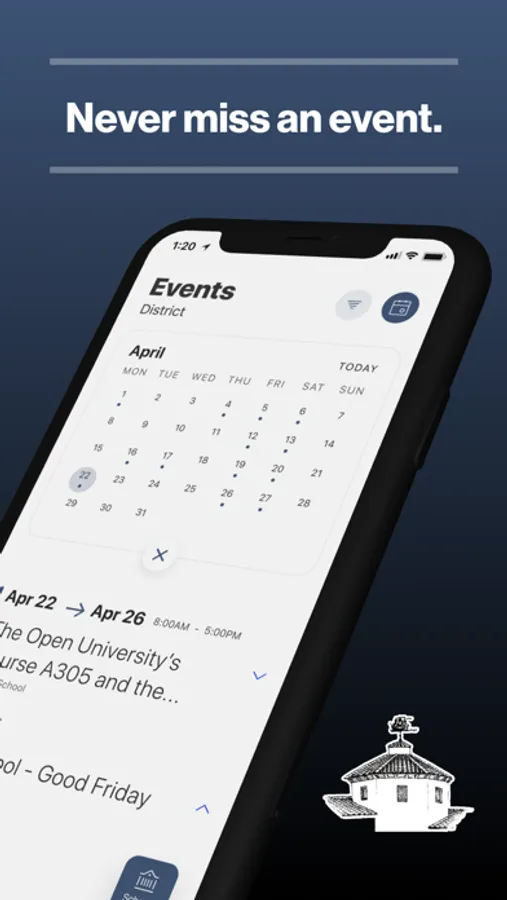 The event section shows a list of events throughout the district. Users can add an event to their calendar to share the event with friends and family with one tap.