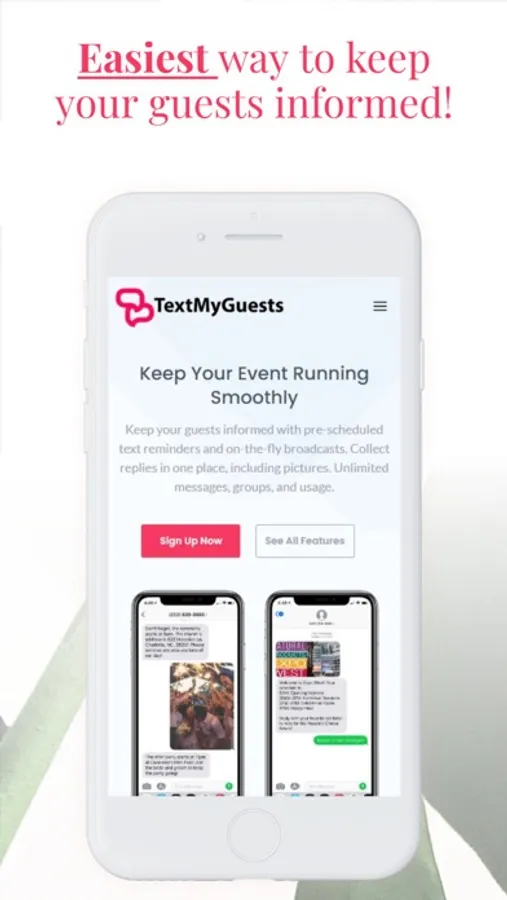 TextMyGuests is a mobile application designed to ease the stress of wedding planning and coordination. Our service allows users to schedule an unlimited number of messages to their guests to keep them informed.