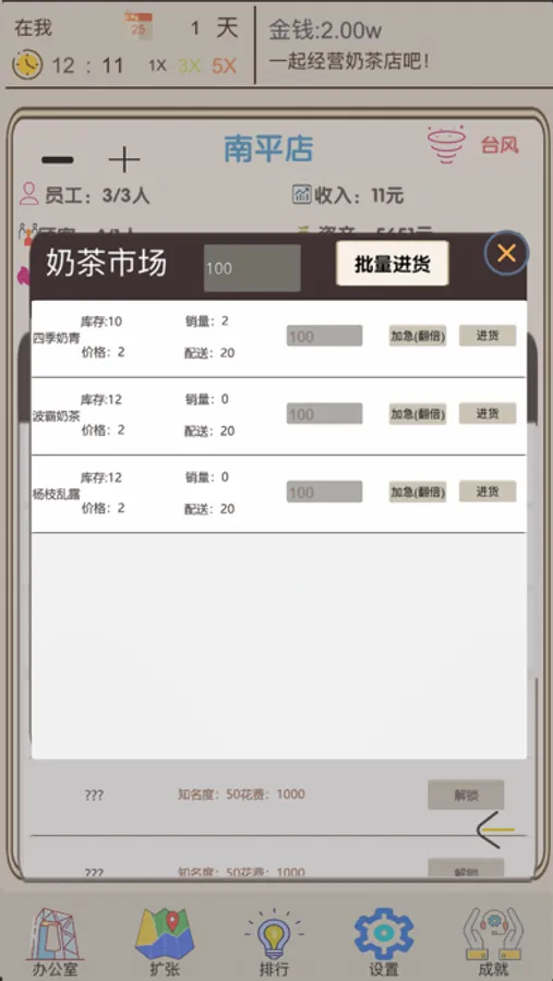 4、引入天气系统,同时天气会影响当天的饮品销量,所以记得看天气预报噢,过度的囤货可能让你的店铺血本无归。