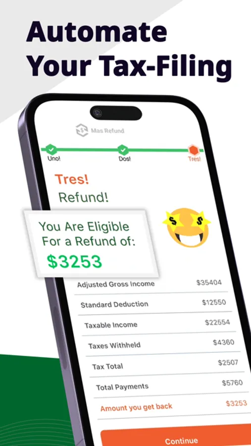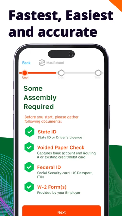 MásRefund is the world's fastest, easiest and most accurate tax-filing solution using Al/ML. It’s as easy as Uno, Dos, Tres! Five minutes from start to finish. With the subscriber's attestation that their data provided is truthful and accurate, MásRefund prepares and files the return with the IRS.