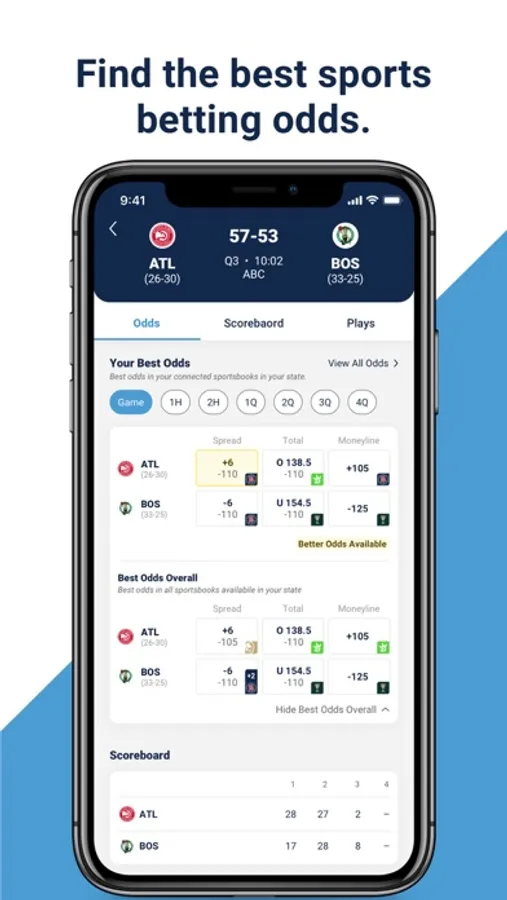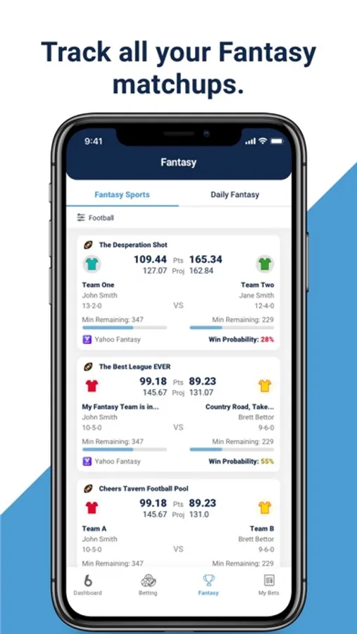 The only app allowing sports fans to track ALL your fantasy sports and sports bets in ONE PLACE. Checking different apps to get updates on all your bets and fantasy contests is annoying! Don’t waste valuable time switching between multiple apps to view all your fantasy lineups, scores, contests, and wagers. Also, have peace of mind knowing that you’re getting the best odds and promotions available to you based on your location and sportsbook accounts with our odds comparison feature.