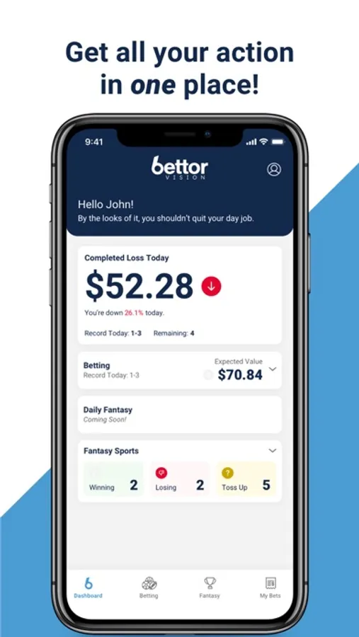 Bettor Vision is a free sports betting and fantasy sports account aggregator that gives you a better view of all of your sports interests and action in one place. We provide an easily digestible dashboard for a quick high-level summary of your complete sports gaming performance as well as more detailed views for price comparison, research, and analysis to ensure consumers get the best deals and make better, more informed decisions.