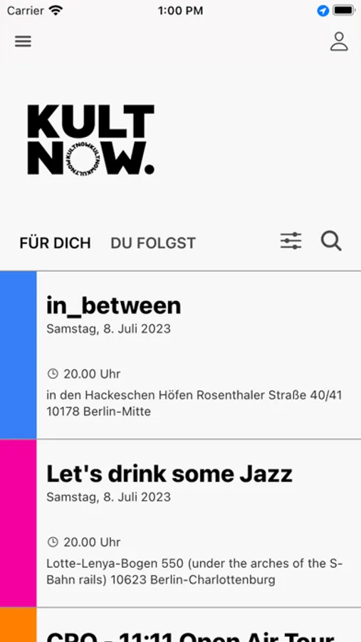 Unsere kostenlose App KultNow bietet ein breitgefächertes Angebot an kulturellen Veranstaltungen in einem personalisierten Feed an. Wir bieten Nutzern Orientierung, Inspiration und eine unkomplizierte, zeitsparende Suche nach passenden Kulturangeboten. Wir schaffen Motivation und Begeisterung für Kunst und Kultur durch einfachen Zugang und individuelle Zusammenstellung.