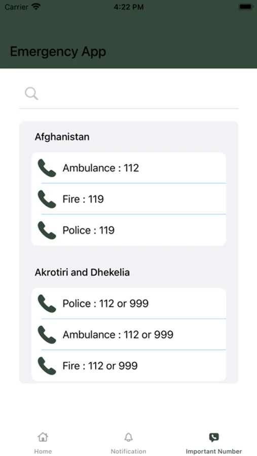 The app finds your location and searches our extensive database of local based emergency services around 190 countries in the world.