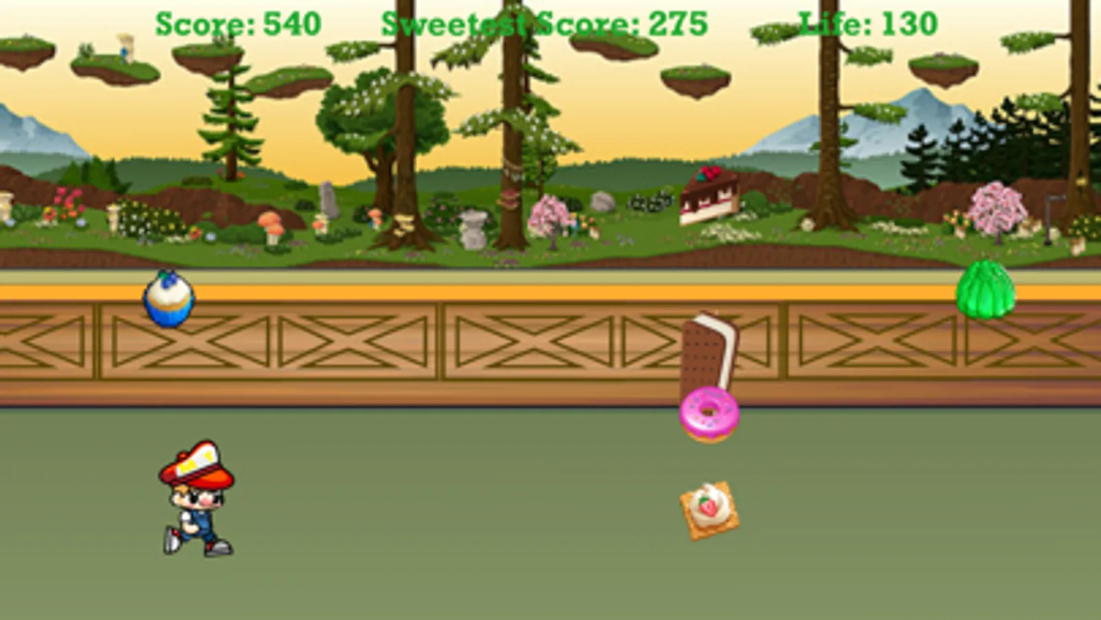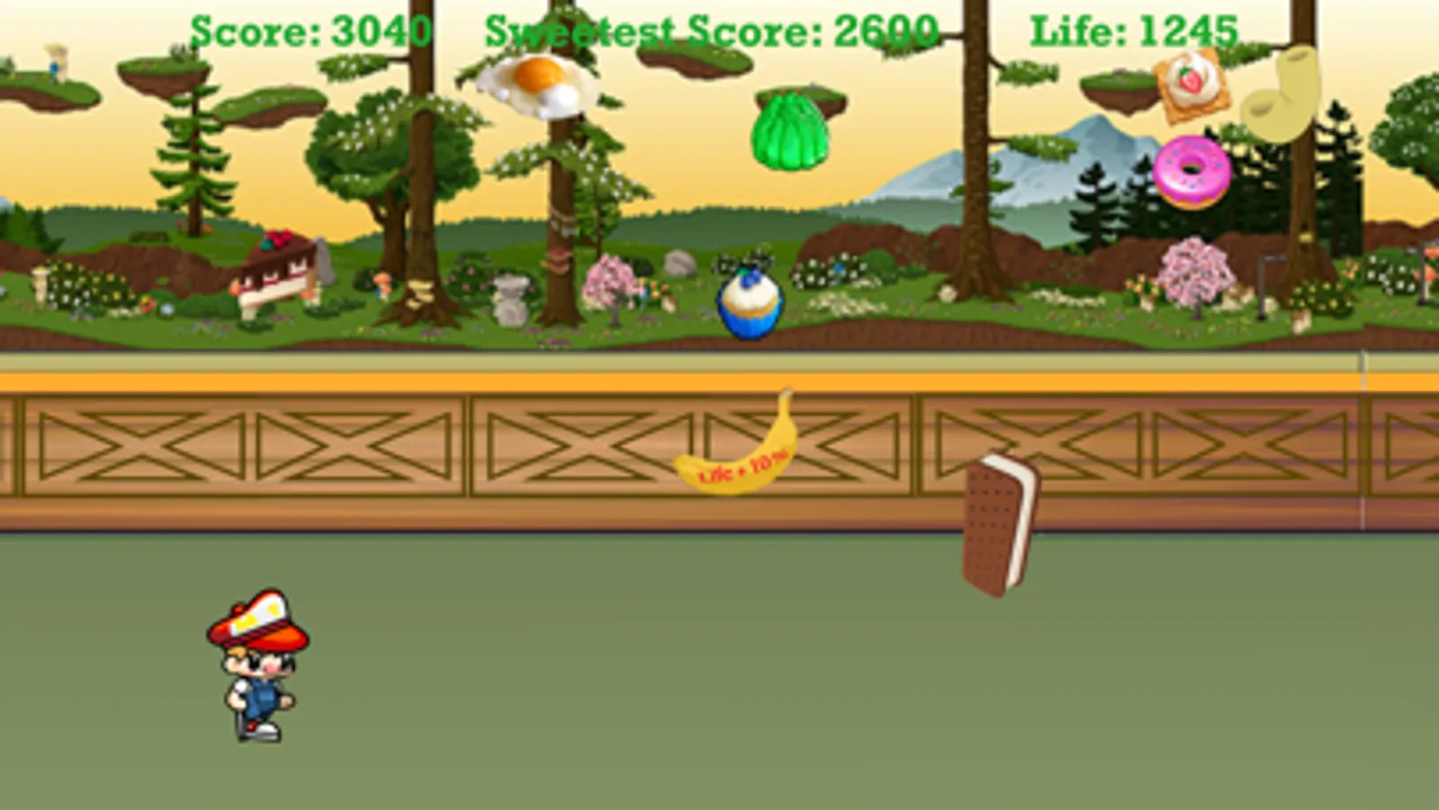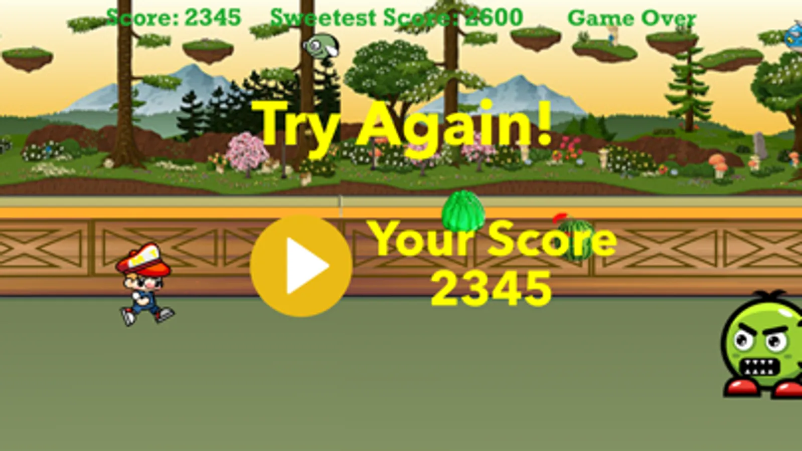 Tap the screen to make Malcolm jump and eat the treats. The faster you tap the screen the higher he will jump, and if you tap the screen continuously at the right speed he will stay in the air. If you quit tapping he will fall back to the ground. When Malcolm eats the treats, he adds points to his score, and when he eats the healthy treats he adds points to his life. But be careful, the macaroni noodle and the egg might give him gas. If Malcolm gets hit by a fly, a bat, Melon Man, or his brothers he will loose points from his life score. If your life score falls to zero you loose and will have to start over. Melon Man and his brothers loose life points and can be defeated by eating the watermelon bombs. The object of the game is to defeat Melon Man and achieve the Sweetest Score. Good Luck and Have Fun.