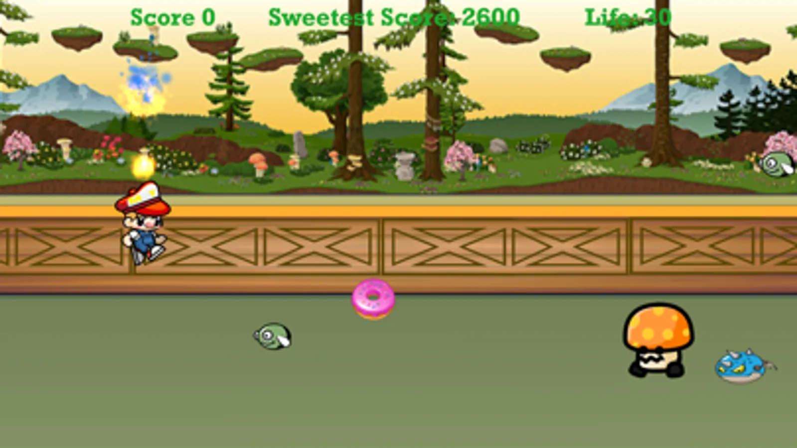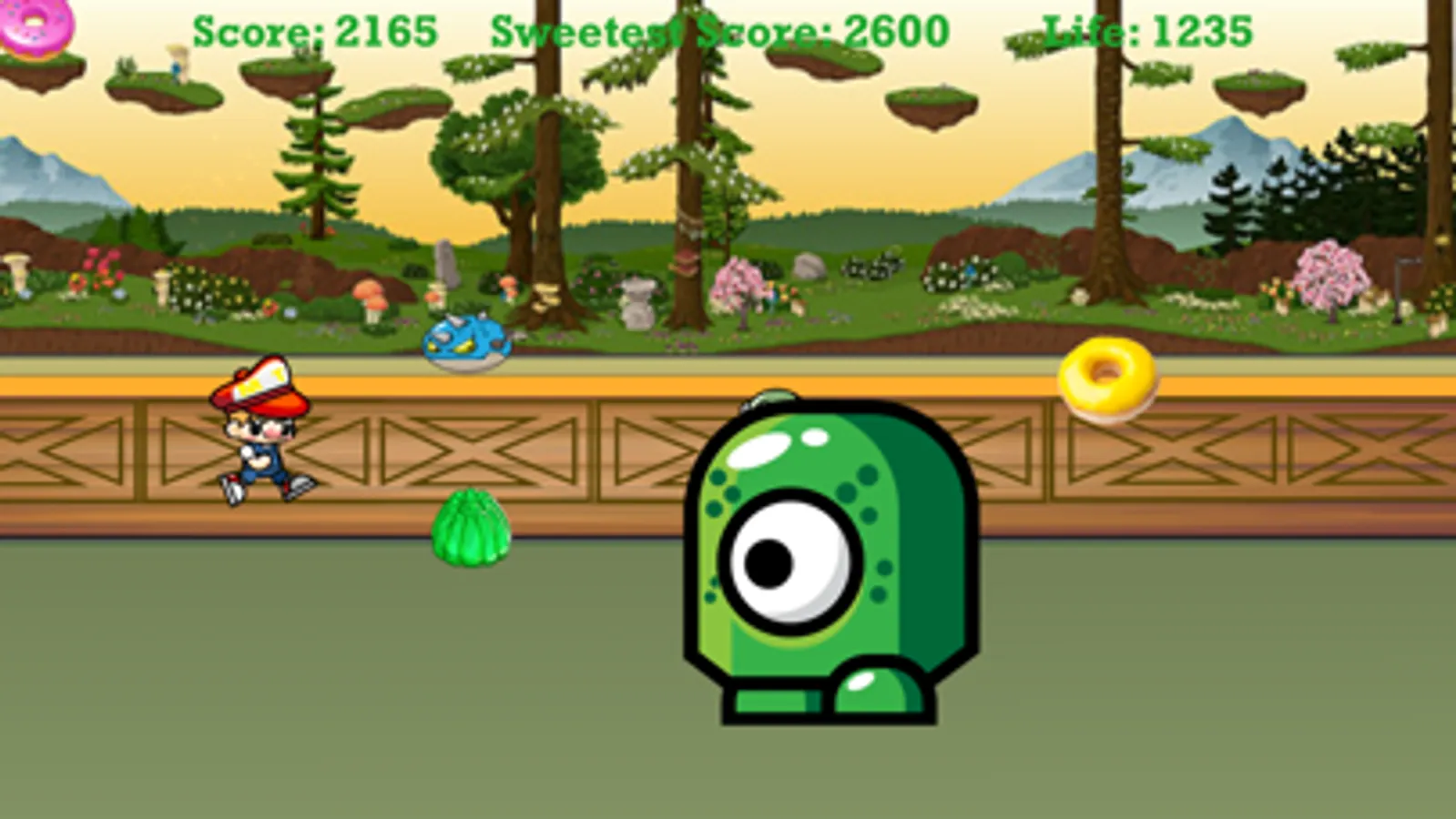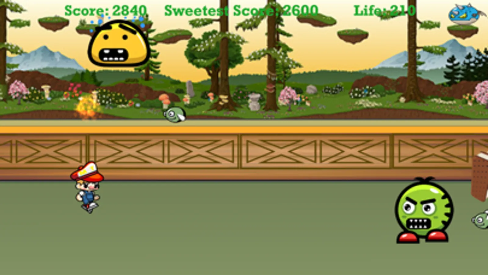 Tap the screen to make Malcolm jump and eat the treats. The faster you tap the screen the higher he will jump, and if you tap the screen continuously at the right speed he will stay in the air. If you quit tapping he will fall back to the ground. When Malcolm eats the treats, he adds points to his score, and when he eats the healthy treats he adds points to his life. But be careful, the macaroni noodle and the egg might give him gas. If Malcolm gets hit by a fly, a bat, Melon Man, or his brothers he will loose points from his life score. If your life score falls to zero you loose and will have to start over. Melon Man and his brothers loose life points and can be defeated by eating the watermelon bombs. The object of the game is to defeat Melon Man and achieve the Sweetest Score. Good Luck and Have Fun.