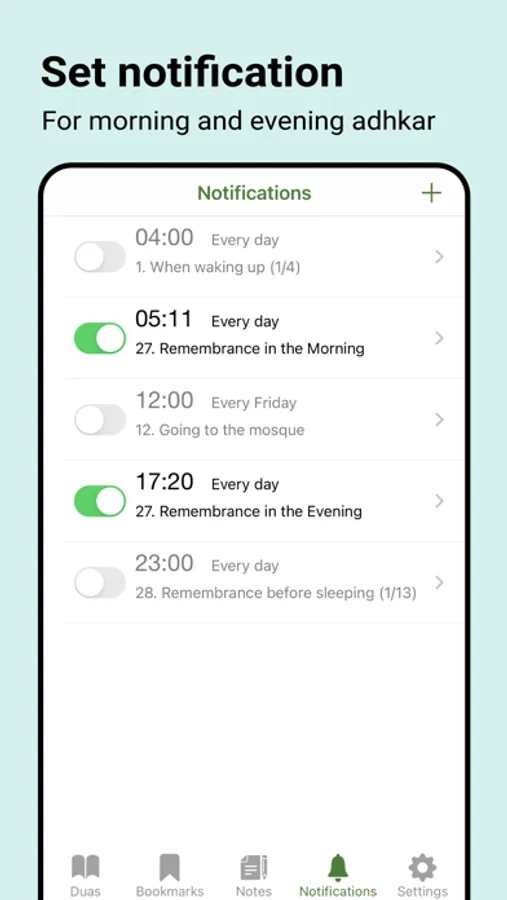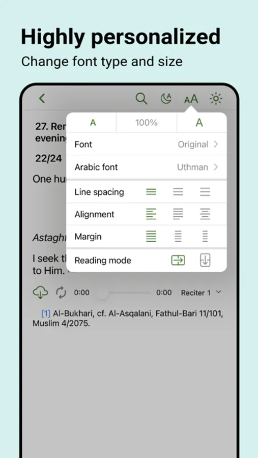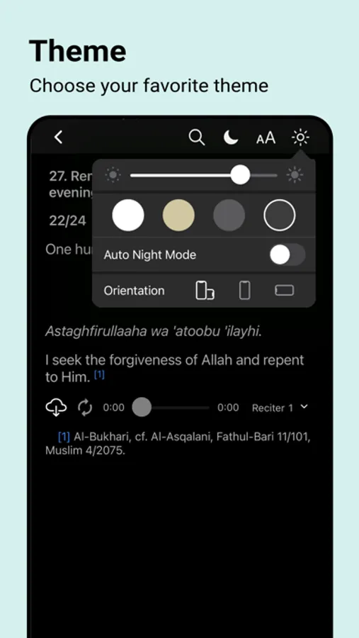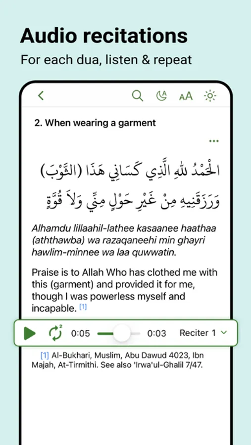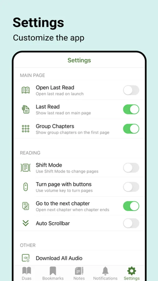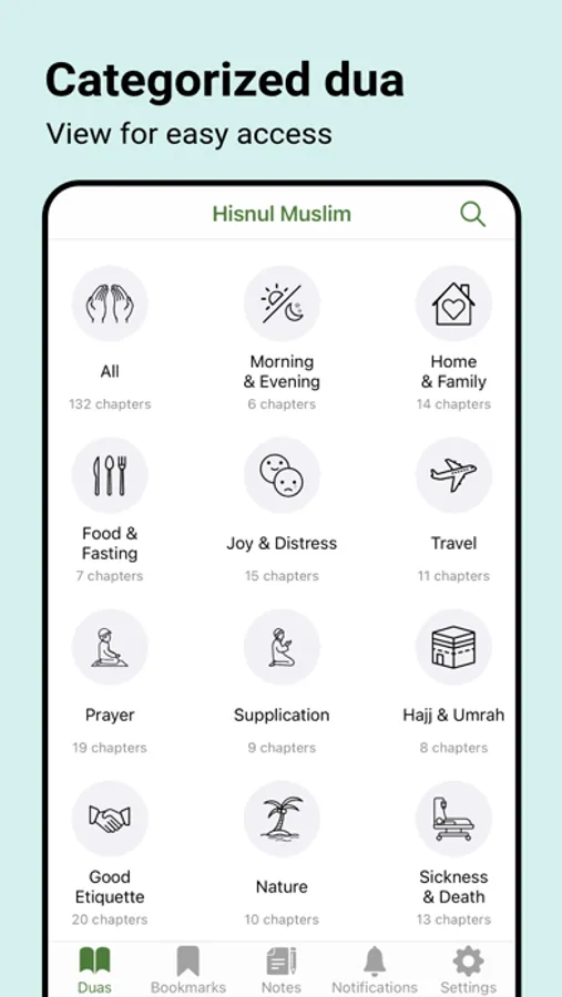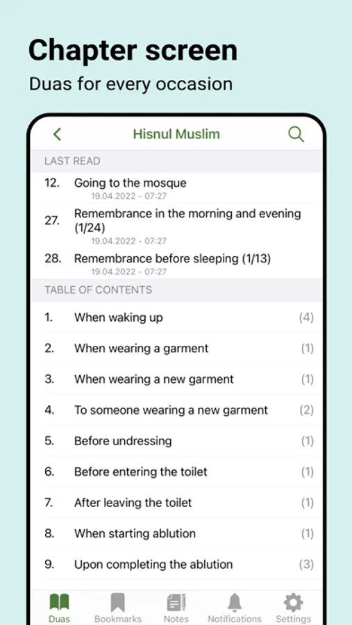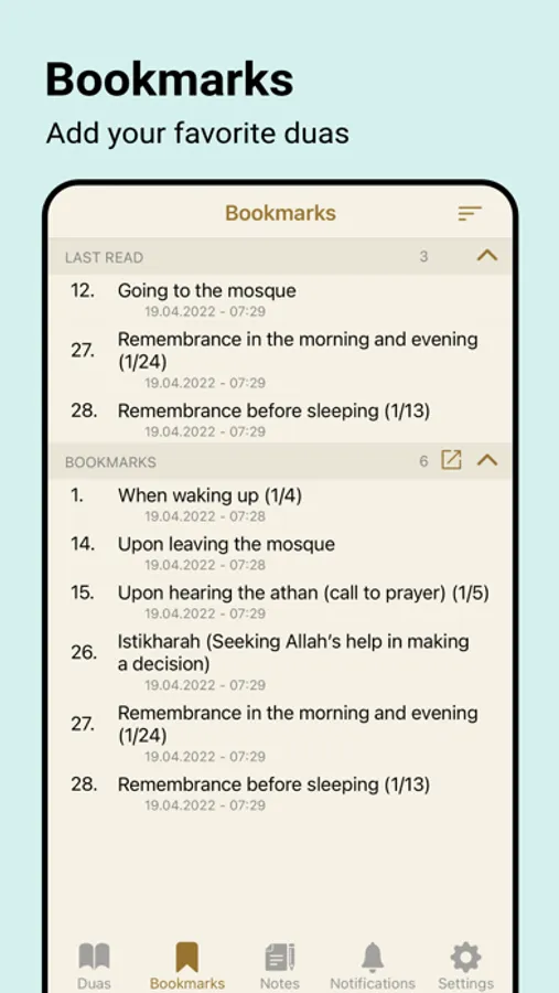 - Add your favorite Duas to "Bookmarks" to access it quickly