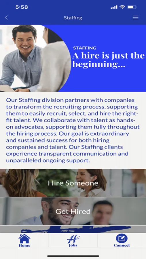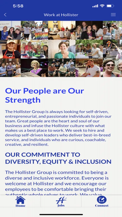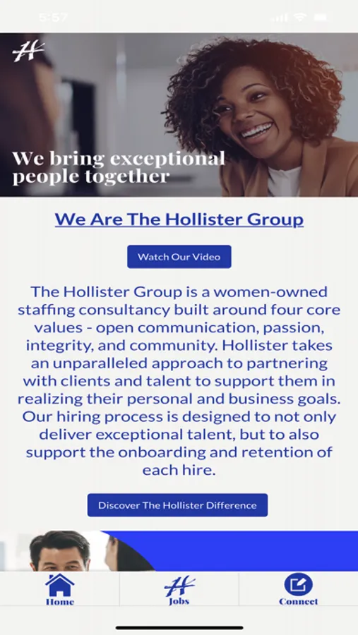 Partner with The Hollister Group to find a job, hire talent at your company, and access leadership and communication coaching that will transform your life and your work culture. Explore our services and programs, inclusive of job listings as well as recorded trainings, meditations, and podcasts, right from your mobile device.