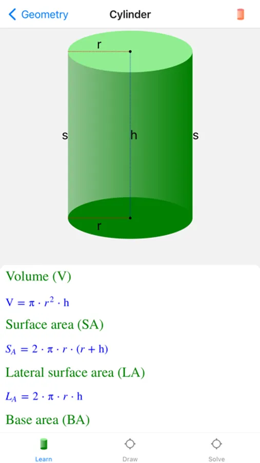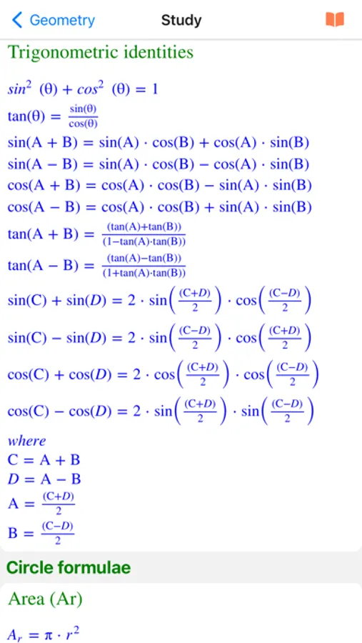 There is also a Study page to help you with learning formulae related to many common geometric shapes.