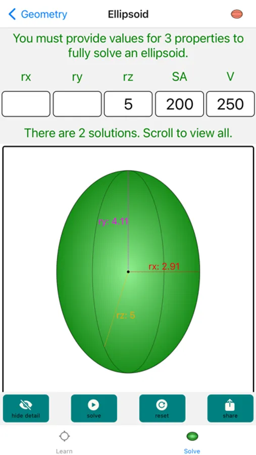 This app not only solves the geometric shapes, it also teaches you the formulas related to each geometric shape as well as it draws the geometric shapes when solved.