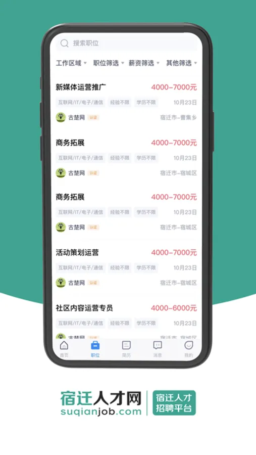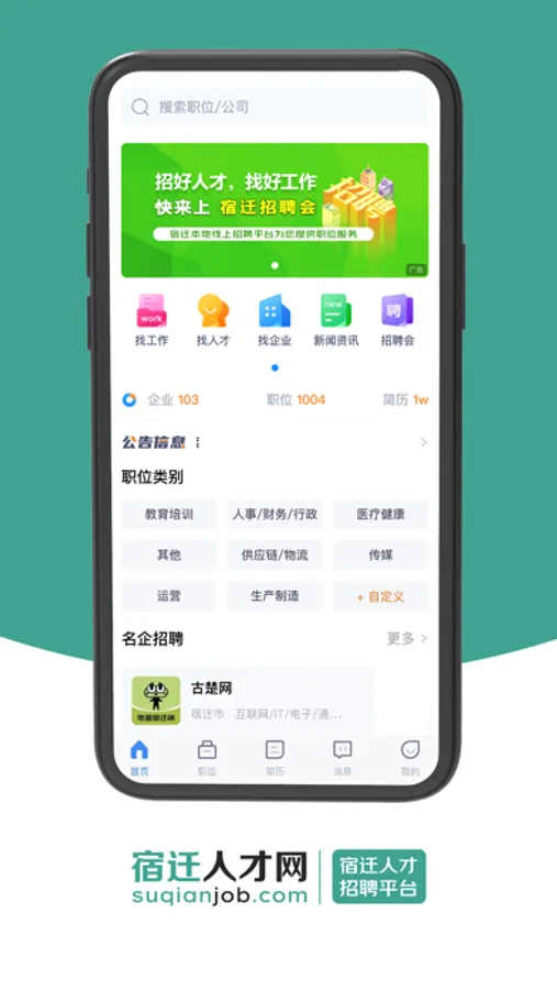 宿迁人才网(www.suqianjob.com)是宿迁地区成立早,规模大的人才服务网站,宿迁地区活泼招聘网络平台,规模大且具备正规人力资源资质的企业,是宿迁地区的人才招聘门户网站。人才市场认可的单位,主办宿迁本地大型招聘会。最新招聘信息请进入宿迁人才网网站或APP!