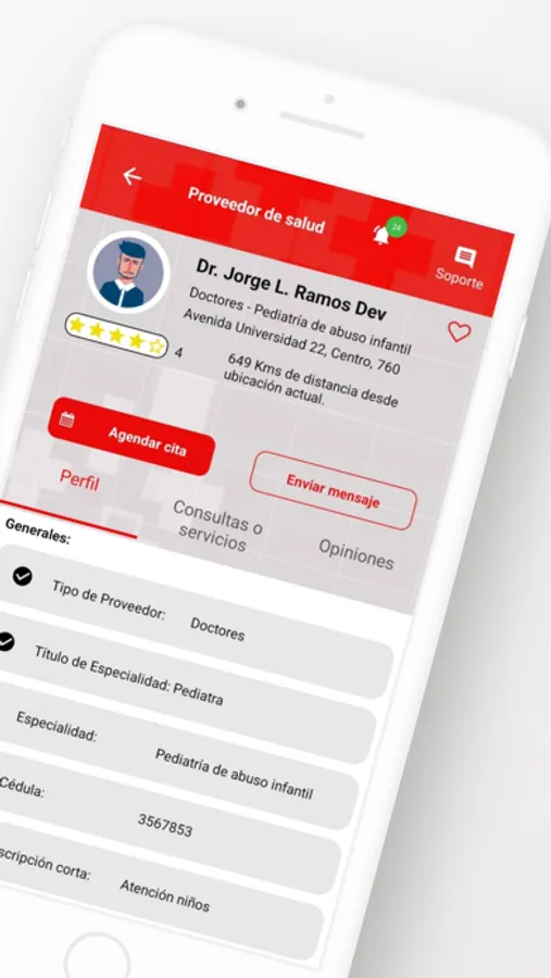 Los Pacientes ingresan opcionalmente los datos de su perfil de Salud y buscan Proveedores de Salud, ya sea por proximidad, ciudad, país, especialidad, experiencia profesional y muchos otros criterios más de búsqueda.
