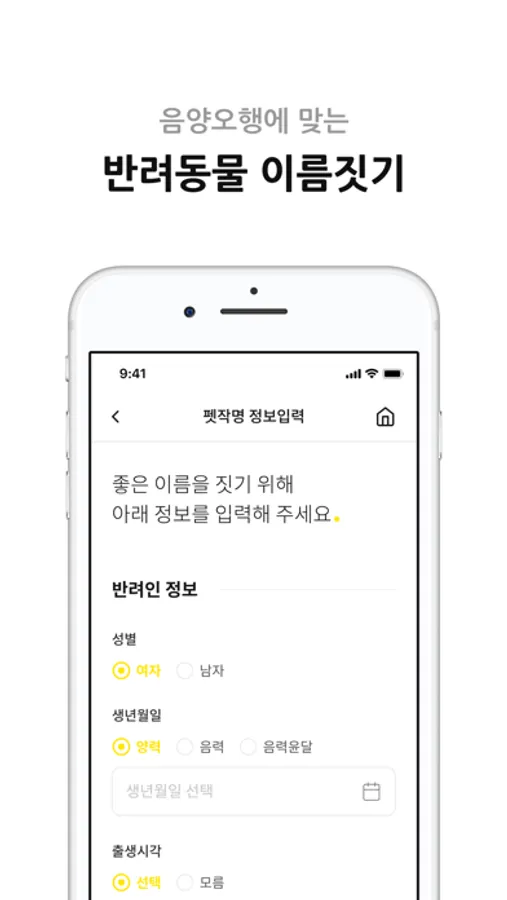 '반려인'과 '반려동물'의 정보를 입력하면 음양오행에 맞는 데이터를 적용시켜 사주 기운과의 조화를 이루는 최상의 이름들이 보여지게 되는데, 유형별로 선택할 수 있도록 하여 개인의 취향을 고려하였으며 카테고리별로 선택된 이름에는 재미있는 어원 풀이도 볼 수 있도록 하였습니다.