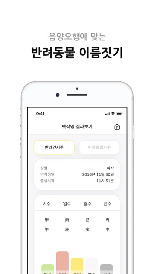 '펫 테크'(Pet-tech)의 기술에 '네이밍' 서비스를 접목시켜 사주와 오행에 맞은 최상의 이름들이 추천됩니다.