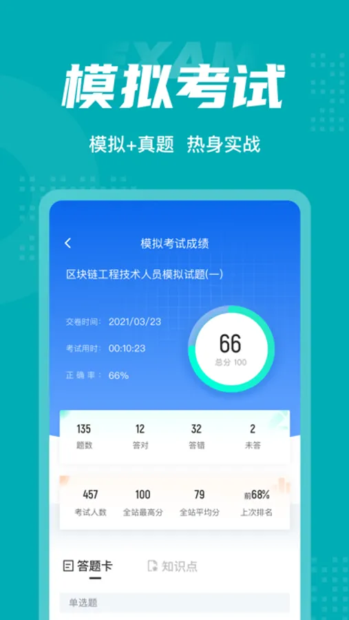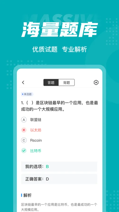 区块链工程技术人员题库内含考点练习,全国通用卷以及地区卷模拟练习,以及按照固定考试比重的随机式的抽题的真题考场,成绩单实时记录考试数据,一点一滴的反馈考生近期学习状态以及自我正确率的提升,大大的给予考生通过考试的信心。