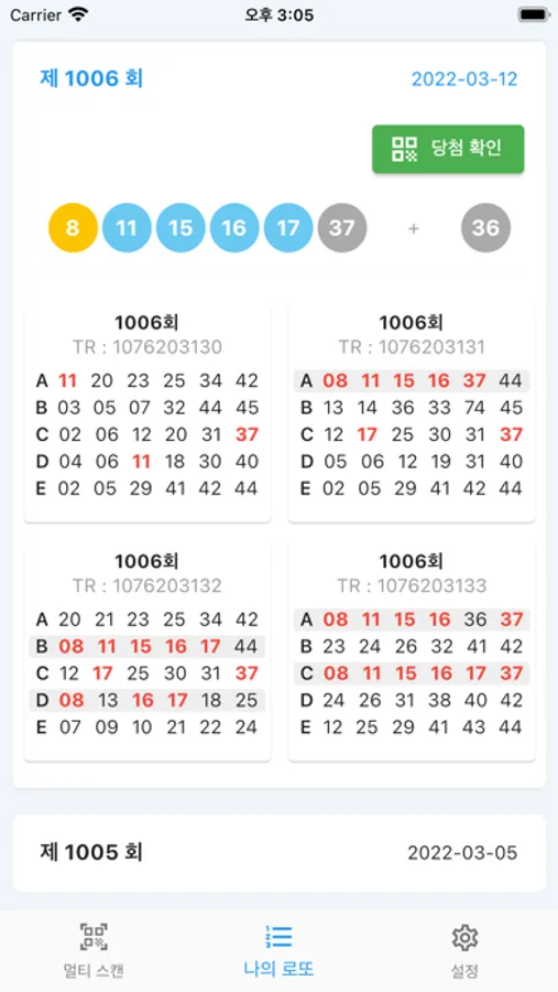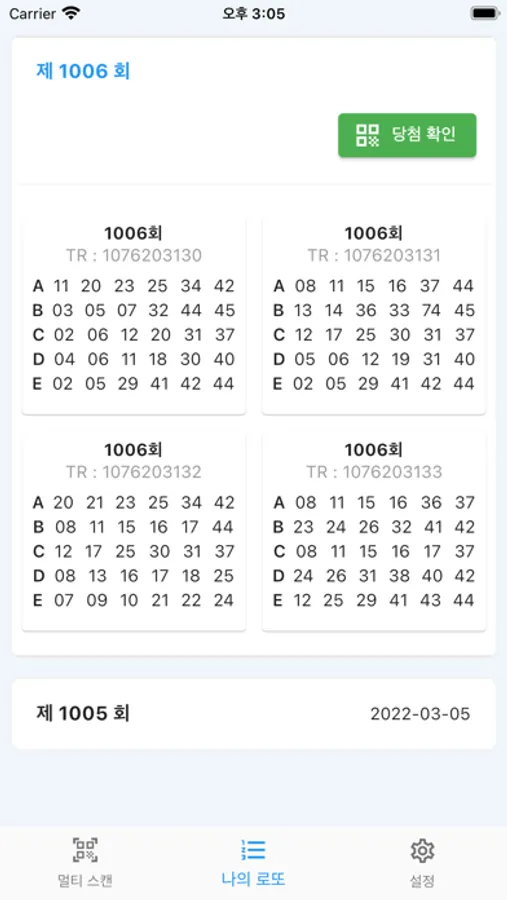 이제는 구매하신 로또 종이들을 QR스캔 후,