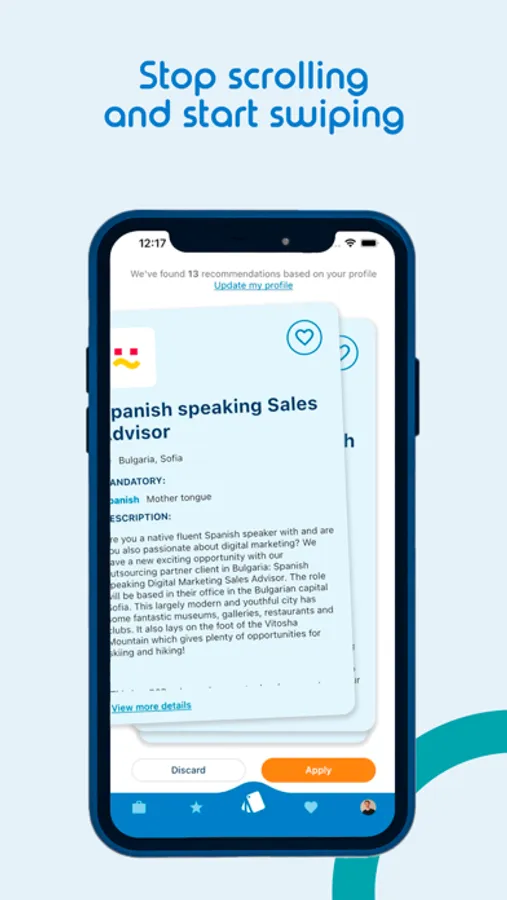 Oh heeey! I see you! Are you a job seeker looking to fire up your career status? Swiping left or right is safer with us - no heartbreaks involved, but if it's a match, you will gain way more than butterflies in your stomach. Our free job app allows you to try new destinations, use your language skills, and discover that there are plenty of fish in the sea. Yep, we're talking about job listings, tailored to your candidate’s profile and your career goals. Are you ready to enjoy this personal & professional experience?