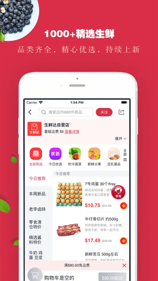 蔬菜肉禽、水产海鲜、米面粮油、乳品烘焙、日用百货等一应俱全,供您挑选。