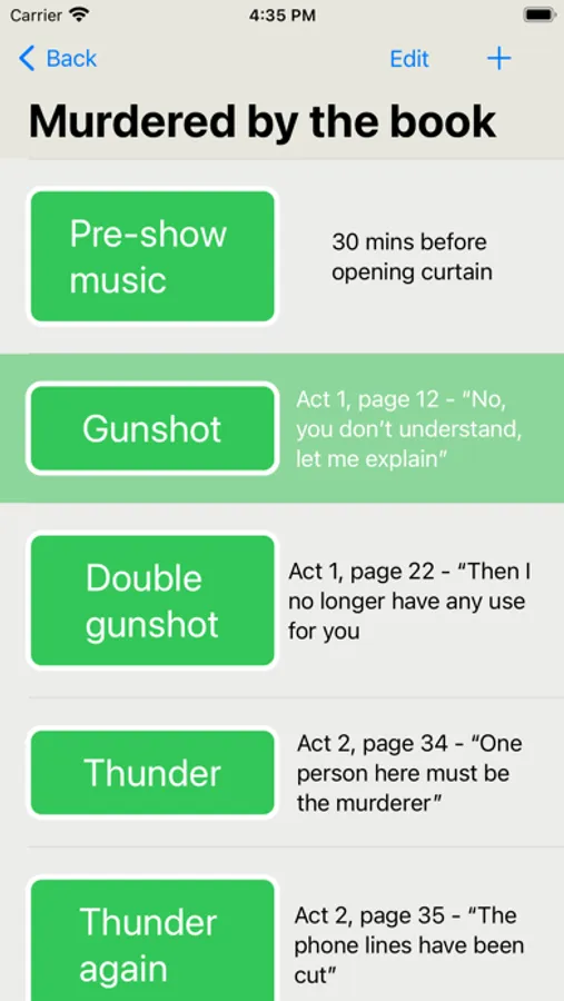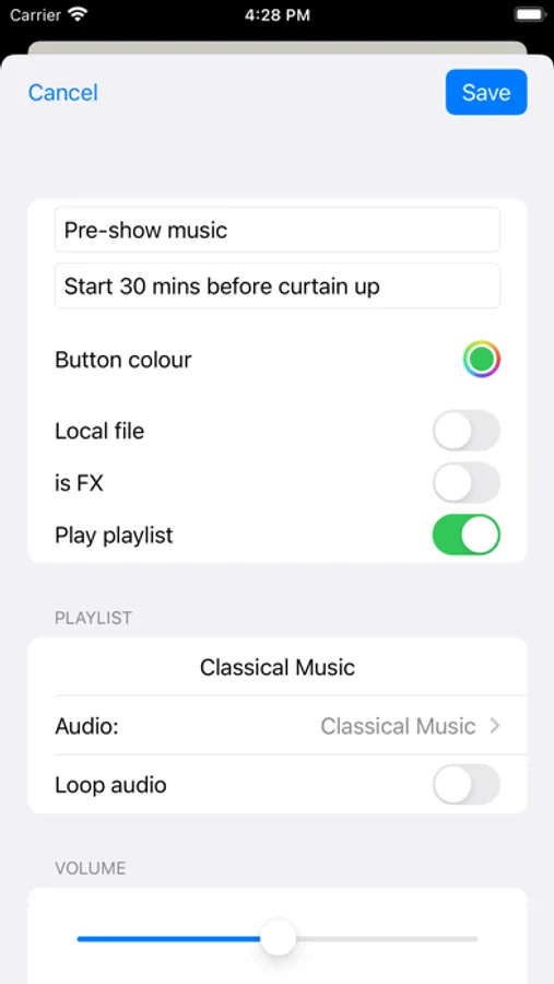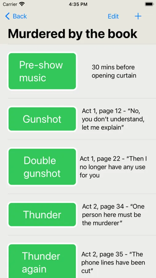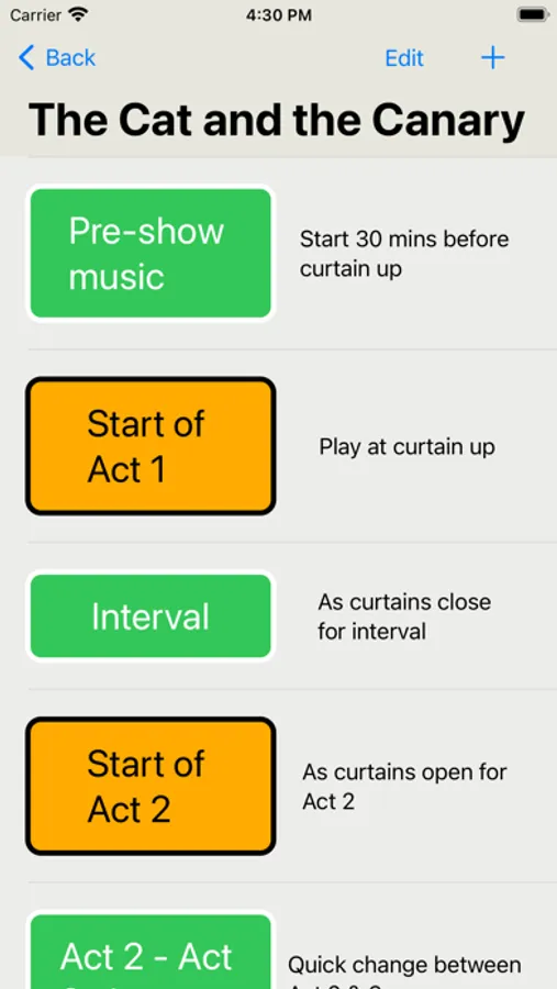 Stage Sounds is designed for small acting companies and groups that want to have music and sound effects with their production in a way that is easy to use without needing expensive equipment. Just set up play lists of your music or sound effects on your iPhone, iPad or Mac, and then pick the playlist that you want to play, give it a name and optionally put in a description of when the person playing the sound should press the button. The app is able to play background music/sound with another separate sound effect over the top.