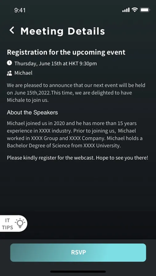 The Event feature is a one-stop event registration and management tool for both online webinars and in-person events. You can easily go to Account > My Event or Features > Event to access event sessions, speakers, and logistics details. For all event registration, you may RSVP on HConnect with one simple click.