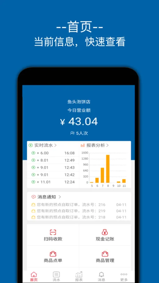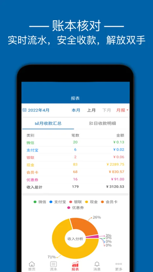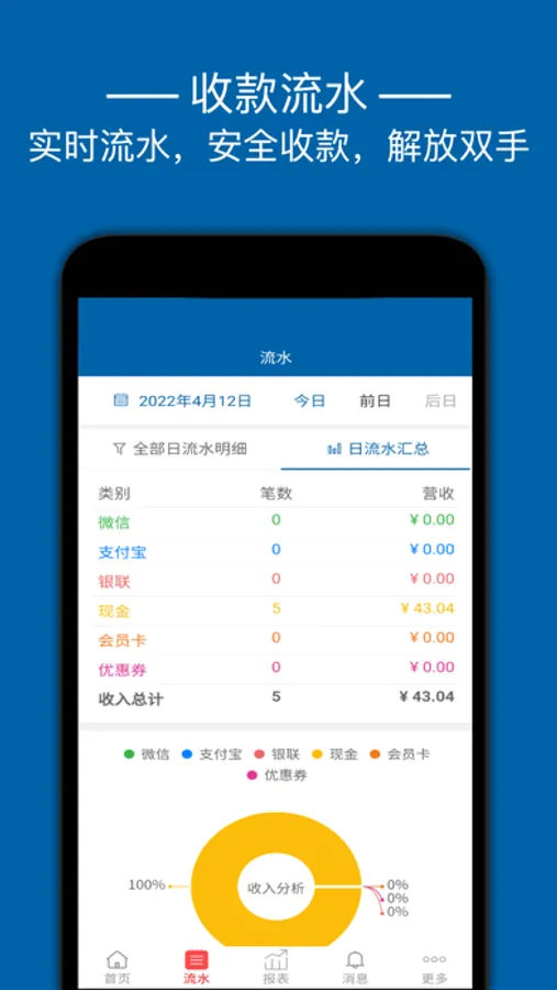 在聚合收银上,为商户提供了微信、支付宝、银联等扫码支付和现金记账,查看实时流水,报表统计,退款等功能,可以配置云音箱和打印机进行语音播报和打印小票。也可以配置扫码盒子实现商户主扫用户收款码收款。