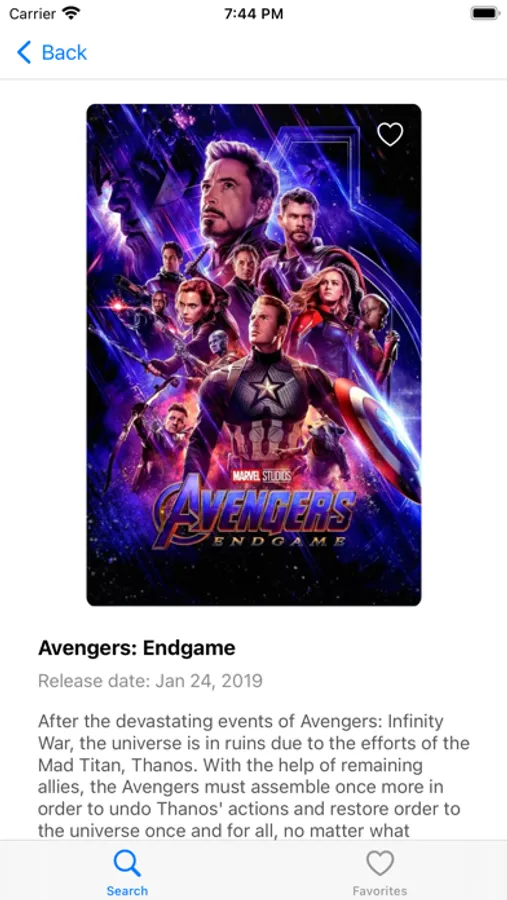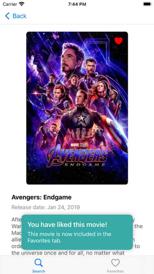 This app allows users to search for movies. They can also 'like' their favorite movies and be able to see it on the Favorites tab.
