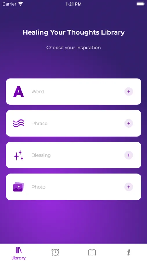 Once you receive the alert go into the Library and tap on the category “word”, “phrase”, “blessing”, or “photo”. A word, phrase, blessing, or photo will appear that will inspire you to stop your current thinking and transmute/transform any negative thinking into positive thoughts. This will also help to shift your attitude and even create an inner smile.