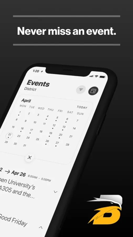 The event section shows a list of events throughout the district. Users can add an event to their calendar to share the event with friends and family with one tap.