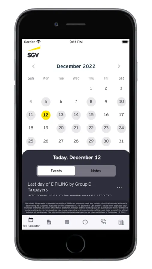 The SGV Tax Calendar app is intended to provide users with a free platform to efficiently keep track of important BIR deadlines, with a flash listing of the tax deadlines falling due on each date in the calendar and user capability to tag tax requirements according to status (e.g., done, pending, N/A) and to add offline notes on each date in the calendar.