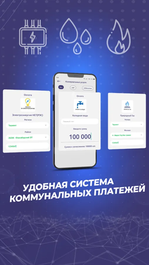 - Оплата услуг: мобильные операторы Узбекистана и оплата мобильных операторов России и СНГ, платежи за интернет в России и СНГ, цифровое телевидение, телефонию, государственные и коммунальные услуги, игровые сервисы и социальные сети, такси, банковские услуги и прочее.
