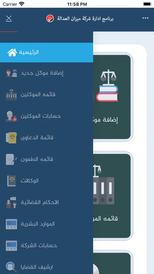 الدعم الفني المستمر, الامن و الحماية المستمرة, واجهة سهلة الاستخدامتوفير الوقت و الجهد, توفر النظام طوال اليوم, نسخ احتياطية دورية, احفظ ملفات الموكلين بكفاءة, نظم حساباتك باحترافية, تنفيذ الاحكام, قسم الشركات, الصادرة, الواردة, الطعون, العقود