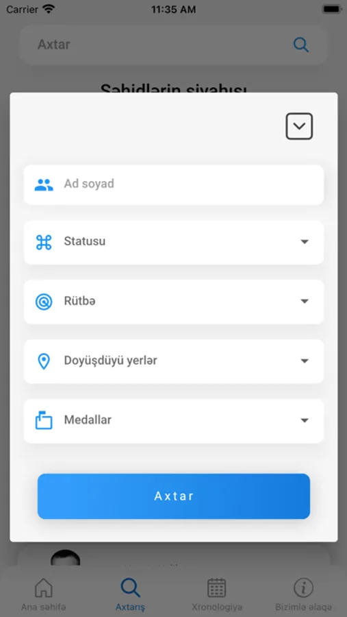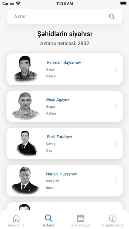 Tətəbiqdə təqvimin cari günündə ad günləri olan şəhidlərin siyahısı da əks olunur.