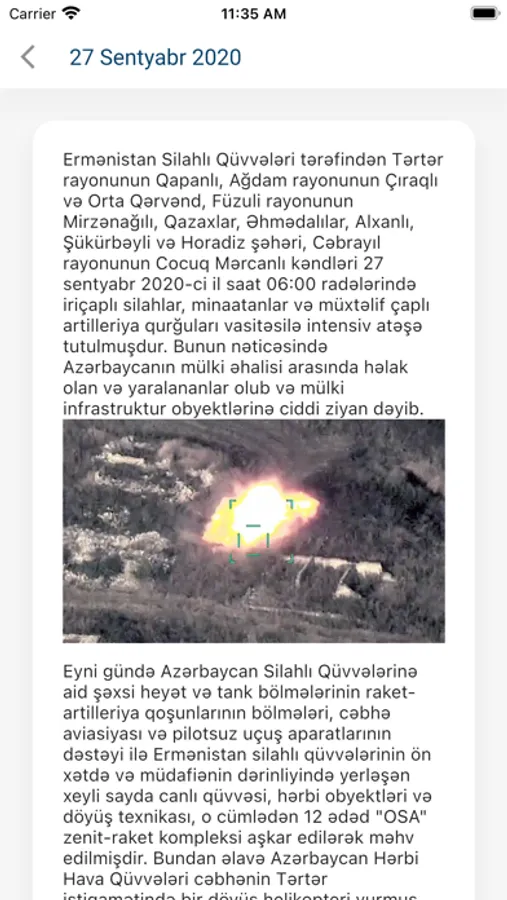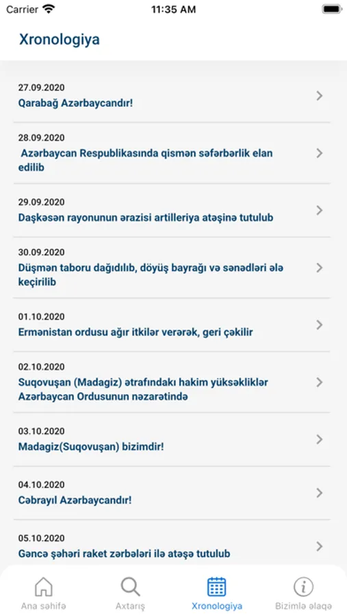 Xronologiya bölməsində 44 günlük müharibə zamanı baş vermiş hadisələr haqqında məlumat əks olunur.