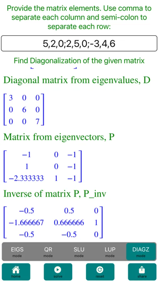 This app has tools to help you analyze matrices like finding eigenvalues and eigenvectors, diagonalization, QR, SLU, LU factorization.