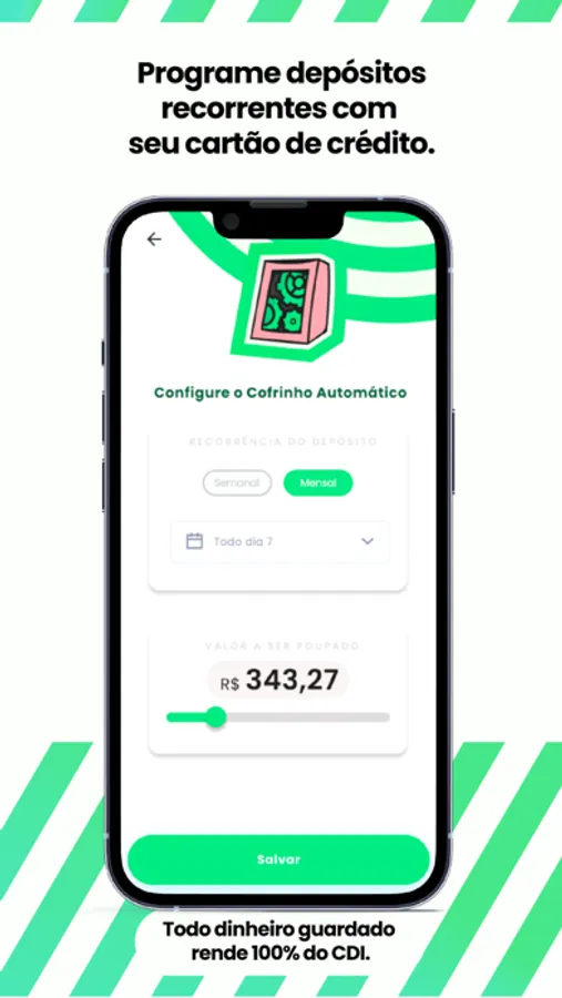 Para o cofrinho automático funcionar basta configurar a recorrência e valor. A transação ocorrerá automaticamente no cartão de crédito da sua assinatura.