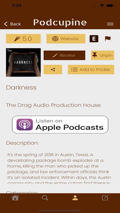 Pins (favorites), prickles (playlists), and quills (ratings/reviews) enable you to keep track of the podcasts you like and listen to.
