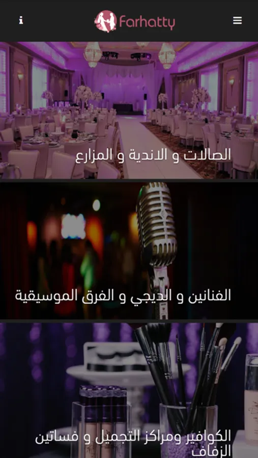 مع فرحتي نوفر ليك كل احتياجاتك من الخدمات الصالات والفنانين والكوافير.... وغيرها في شكل حجز مسبق. وكمان تدفع وانت في بيتك من غير ماتتعب كل ماعليك تحمل التطبيق وتنجز خدمتك مع فرحتي انتظرنا في بيتك بفرح.