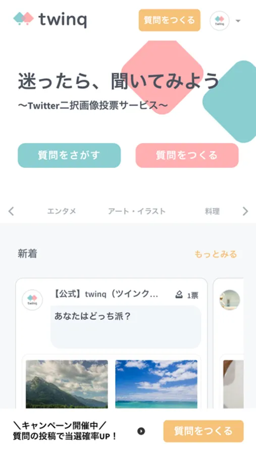 twinq(ツインク)はTwitterに気軽に質問を投稿できるサービスです。回答も簡単!回答結果は年齢や性別などで詳細にグラフで表示されるので、しっかり分析できます。