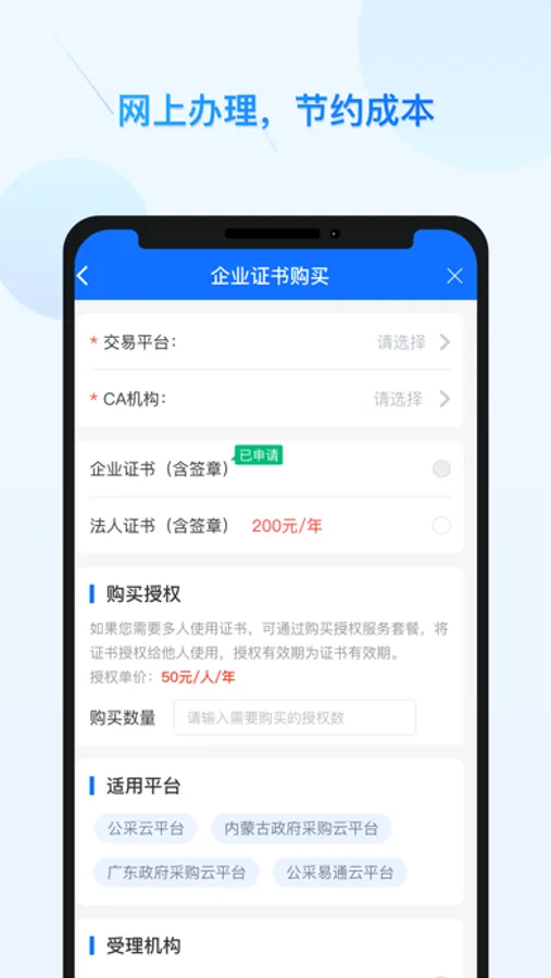 公采易通是一个移动数字证书平台,为企业用户、自然人用户提供证书申请、印章申请等功能;同时在电子卖场、电子招投标等交易场景中,实现数字证书的应用,包括扫码登录、扫码签章、扫码加密、扫码解密等。