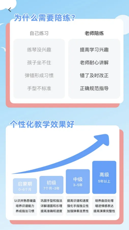 专业老师在线1对1真人陪练,上课时间随心选,专业教师随心挑,配备专属课程班主任,交流反馈,视频授课,实时解答,解决孩子手型指法、节奏错音等各类问题,并根据学生的性格进行个性化陪练,与孩子实时互动,使孩子在练琴过程中不会感到枯燥,每节课以评分、语音或文字的形式给出详细陪练报告,督促孩子练琴,加强孩子的基本功,陪孩子度过学琴的坎儿,培养孩子良好的乐感。
