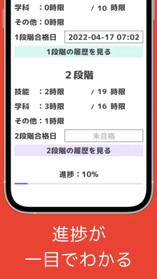 必修時間数(教習所の卒業に必要な授業数)を指定することで、今の進捗を確認できます。