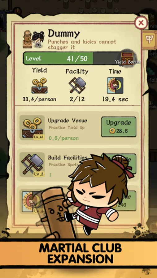 Minifist is a Martial Club simulator with brand new building gameplay. In the club, you need to effectively finish various ability training and recruit more disciples, let them help you build the club so you can offer more to teach them, in the end hoping them to study well and become Wulin Masters.