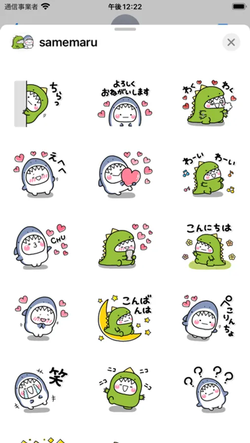 恐竜とサメの着ぐるみを着たしろまるの、怖い(?)ステッカーです。【作:いしいともこ】